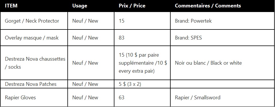 Ici vous pouvez trouver du matériel que nous avons en vente. Parfois, il s’agit de matériel de seconde main provenant de personnes qui ne l’utiliseront plus. D’autres fois, nous avons de nouveaux articles que nous avons achetés en gros et nous n’avons pas encore trouvé de propriétaire. En tout cas, ce sont des prix intéressants ! Si vous avez également du matériel que vous souhaitez vendre, nous pouvons faire l’annonce pour vous. Les prix sont définitifs (pas besoin d’ajouter de taxe). Send us a message to see availability and you can do e-transfers to admin@dnlaval.ca in case we still have it.