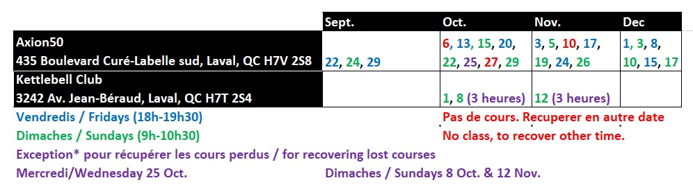Jours de récupération du cours (il y aura un double cours pour ceux qui le font deux fois par semaine) : 8 octobre, 12 novembre.
