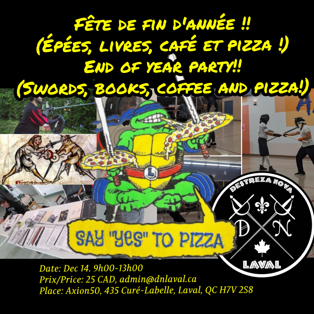 Le Samedi 14 décembre, nous organiserons une fête pour célébrer la fin de l’année. Nous aurons des livres à parcourir, de nombreuses armes pour faire du sparring gratuit, du café ET DE LA PIZZA!! Pendant ce temps, les instructeurs pourront encadrer les étudiants et leur donner des conseils tout en combattant jusqu’à l’épuisement. Recommandé à tous!!