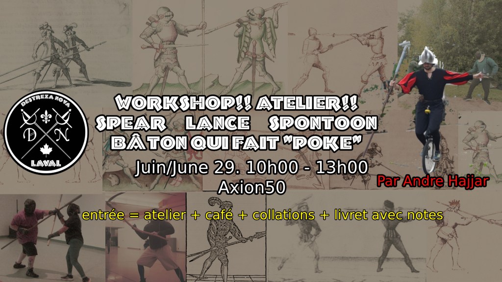 Nous allons travailler avec des armes d’hast! Nous rencontrerons des auteurs qui les utilisent, en plus de travailler (comme d’habitude) avec les concepts de Destreza pour devenir des escrimeurs exceptionnels avec n’importe quelle arme. Les frais d’inscription sont de 67 $ ou 47 $ si vous venez avec un t-shirt de notre club. Si vous êtes membre du club, venez afficher vos couleurs. L’entrée comprend un café, un atelier, des collations et un livret théorique.